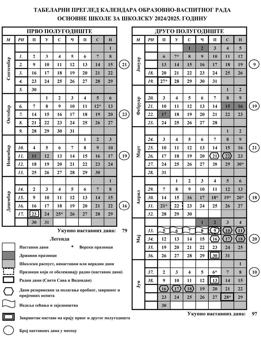 Табеларни преглед календара образовно-васпитног рада основне школе за школску 2024/2025. годину одштампан је уз овај правилник и чини његов саставни део.